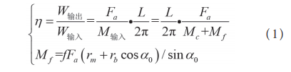 式中,Fa是滾珠絲杠副負(fù)載(N),L是滾珠絲杠副導(dǎo)程(mm),Mc和Mf分別為承載力矩和摩擦力矩(N·m),f是當(dāng)量摩擦因數(shù),表示滾珠絲杠副接觸面上各種摩擦合成的摩擦力與接觸載荷的比值,rm是絲杠名義半徑(mm),rb是滾珠半徑(mm),α0是初始接觸角(°)。