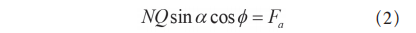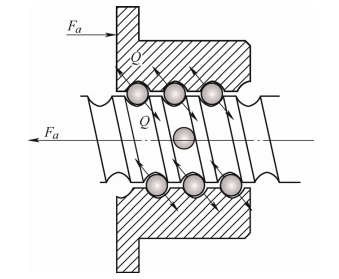 負(fù)載影響滾珠絲杠副接觸面的當(dāng)量摩擦因數(shù)。如圖2所示,當(dāng)螺母承受負(fù)載時(shí),螺母的軸向載荷由螺母內(nèi)各滾珠受到的接觸載荷軸向分量之和來(lái)平衡,假設(shè)各滾珠受載均勻,可得到如下關(guān)系式